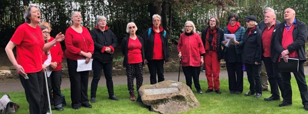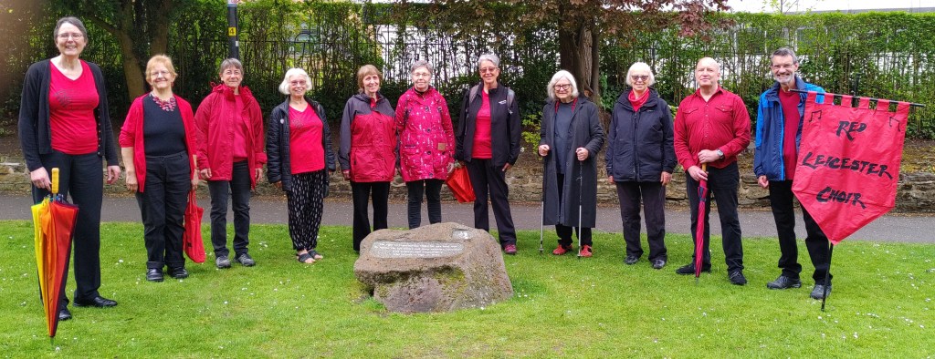 Red Leicester choir joined CND activists on 15th May, to commemorate Conscientious Objectors Day. The group gathered around the Peace Stone, close to the Arch of Remembrance War Memorial at the top of Peace Walk, which honours the 250 known objectors from Leicester and the surrounding area who refused to fight in the World Wars. The organiser spoke powerfully about Conscientious Objection in its broadest sense and included the moral objection to Trump’s ideology and actions. We listened to parts of a letter from a courageous 18yr old Israeli young man, who has spent time in jail for being a CO. Other stories were shared including a Quaker testimony piece about a woman who objected to signing up for war work which was a legal obligation. Red Leicester sang Song of Peace, Power of Love and The Whole Wide World Around. Richard spoke about how radical the last pope had been on peace (if not gender and gay rights politics). We heard some peace poetry too. This event is marked annually in Leicester and Red Leicester are proud to support it.