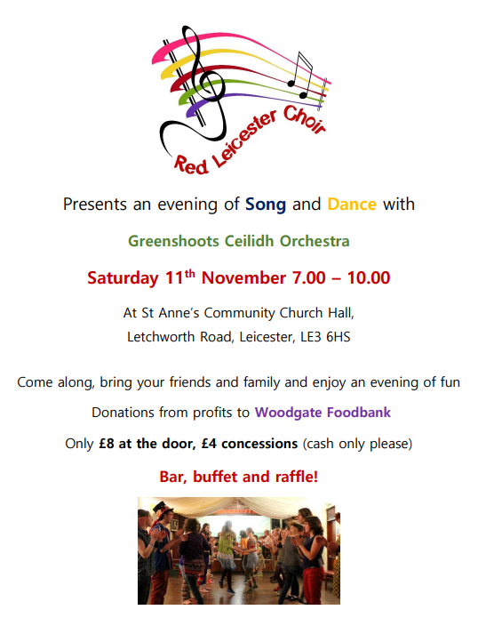 Saturday 11th November saw the return of the Red Leicester fundraising ceilidh with the Greenshoots Orchestra. The event was brilliantly successful, the crowds came and every ticket was sold and a joyous time was had by all. There was dancing and food cooked by the choir members themselves; the choir sang six songs of hope for change during the evening. Thanks to the generosity of all who joined us, we raised £630.60 for Woodgate Community Food, a food bank now part of Alice Hawkins Community Projects.