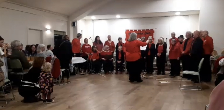 Members of Red Leicester Choir sang to support an Amos Trust event in Leicester on Monday 29th November 2022, which is raising funds this Christmastime to help women of Gaza, with breast cancer, as part of its Palestine Justice campaign. [For more information see Amos Trust Christmas Appeal and Palestine Justice (amostrust.org)]