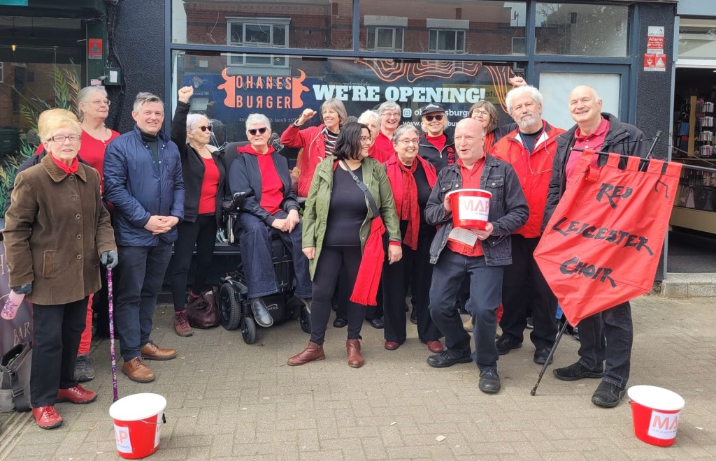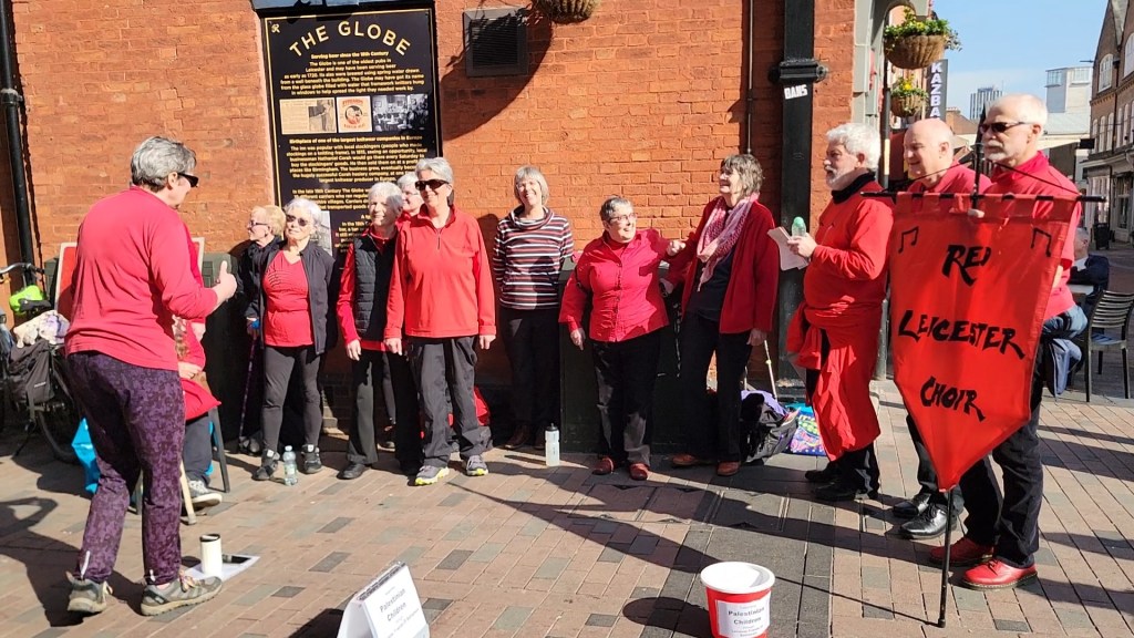On Saturday 16th March a select band of Red Leicester Choir busked in the city centre for Medical Aid for Palestinians and raised £124.64 in the hour’s singing and a final total of £250 after generous donations.