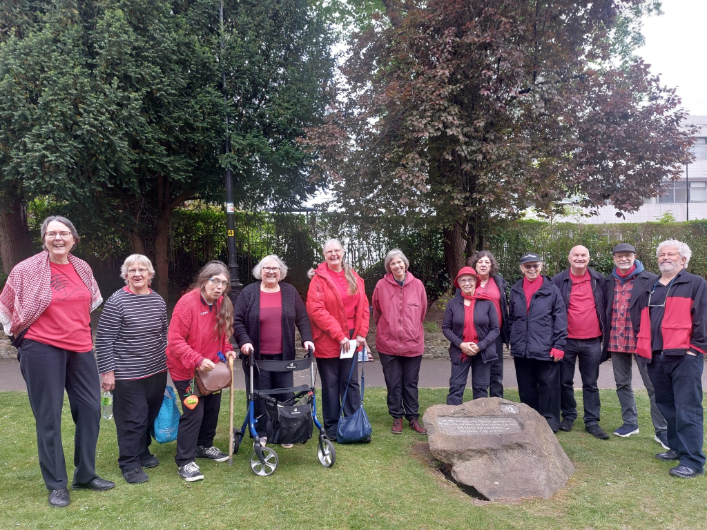 Red Leicester joined CND and other supporters of peace in Peace Walk by the Peace Stone to honour conscientious objectors from Leicester and Leicester who suffered in the world wars. We sang Keep you in Peace and Song of Peace and talked about Ukraine and all the groups of people who courageously stood for their principles. We also remembered Penny Walker who persuaded the City Council to change the name of Memorial Walk to Peace Walk and provide the Peace stone.