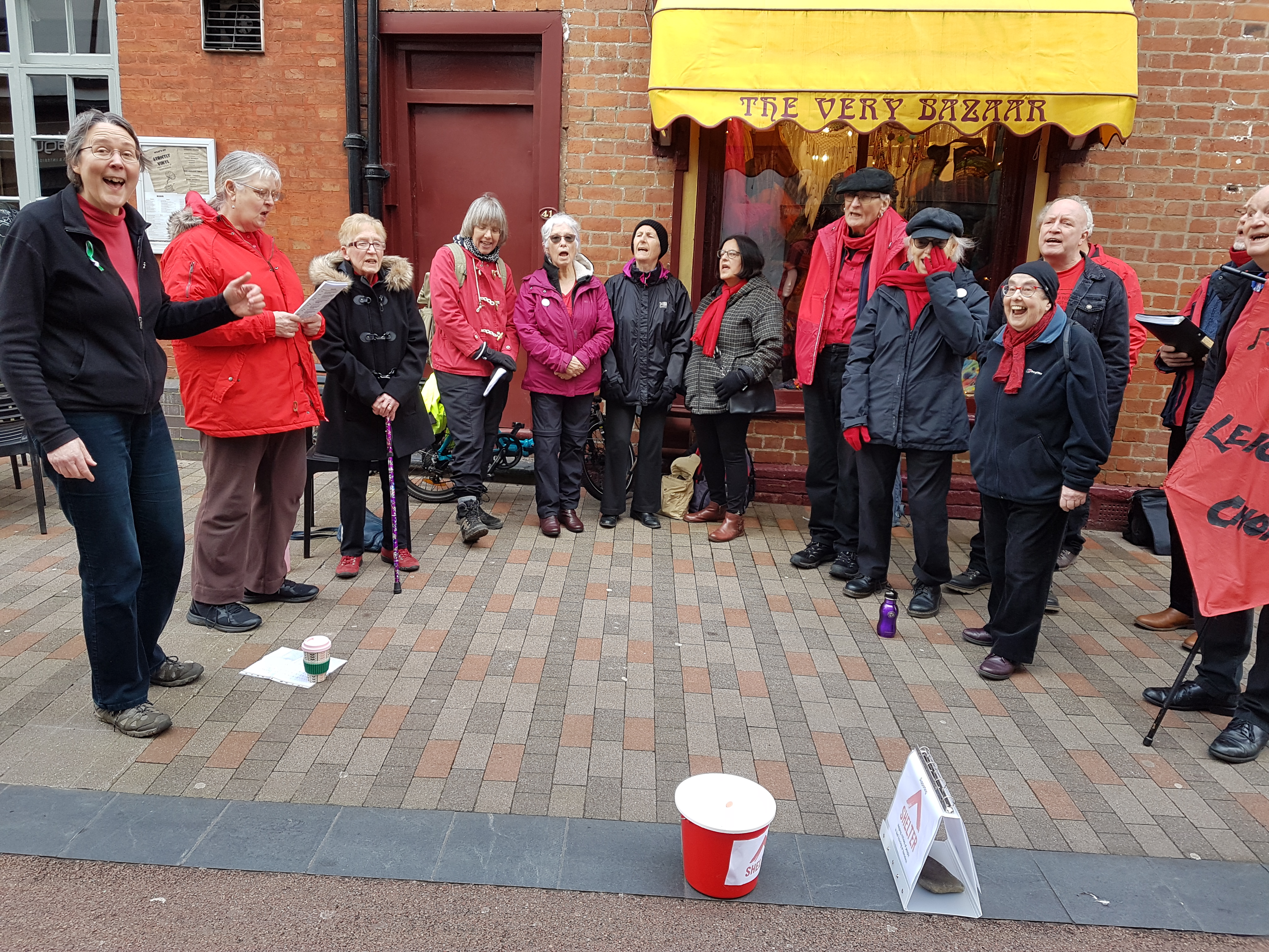 On Saturday 16th March a select band of Red Leicester Choir busked in the city centre for Medical Aid for Palestinians and raised £124.64 in the hour’s singing and a final total of £250 after generous donations.