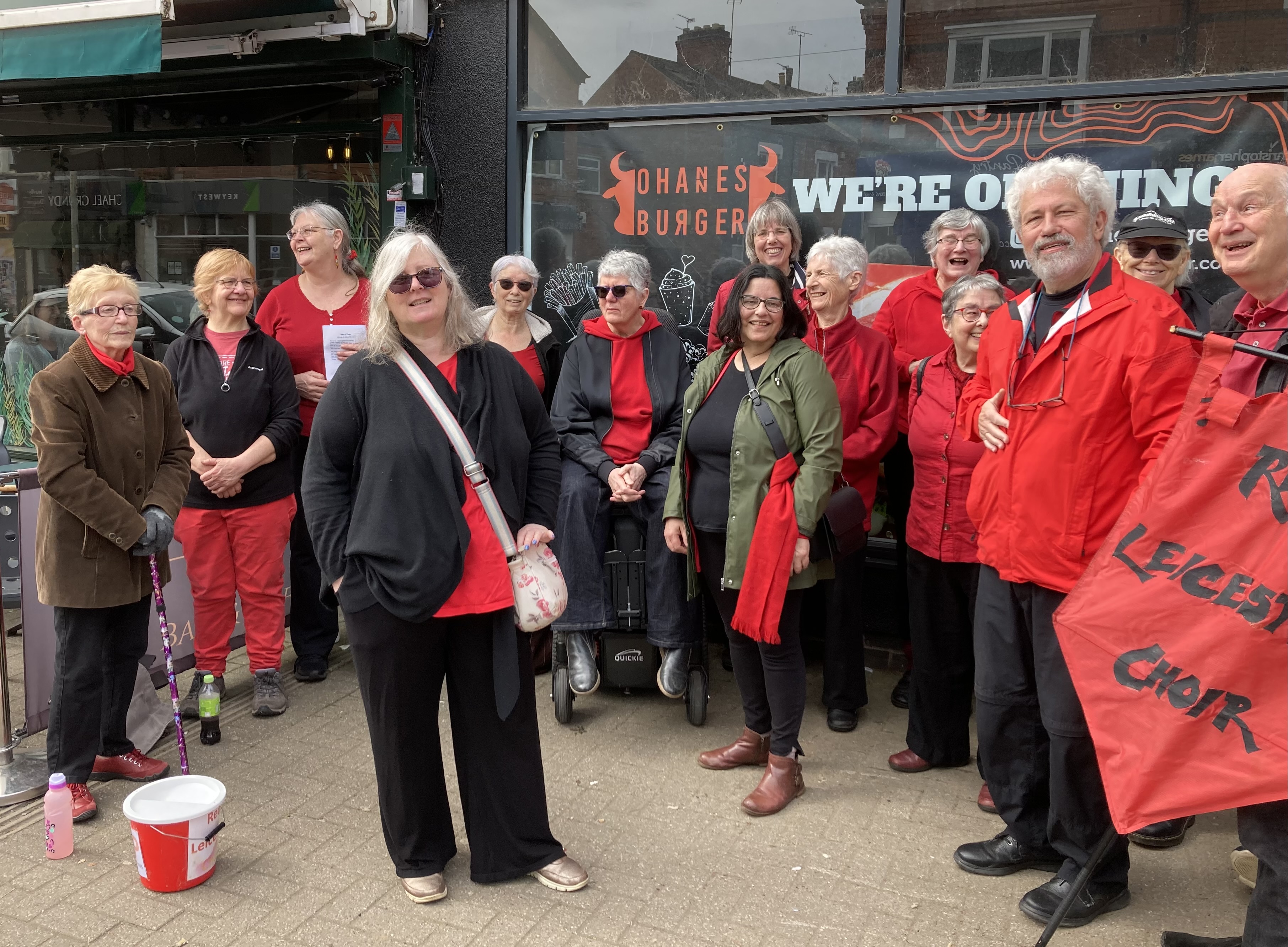 Red Leicester’s first busk of 2025 raised £77 for One Roof, Leicester’s homelessness charity. A young girl stopped to tell us how lovely we sounded, lifting our spirits on a cold damp morning. Choir members donated £125 to One Roof in December in lieu of busking.