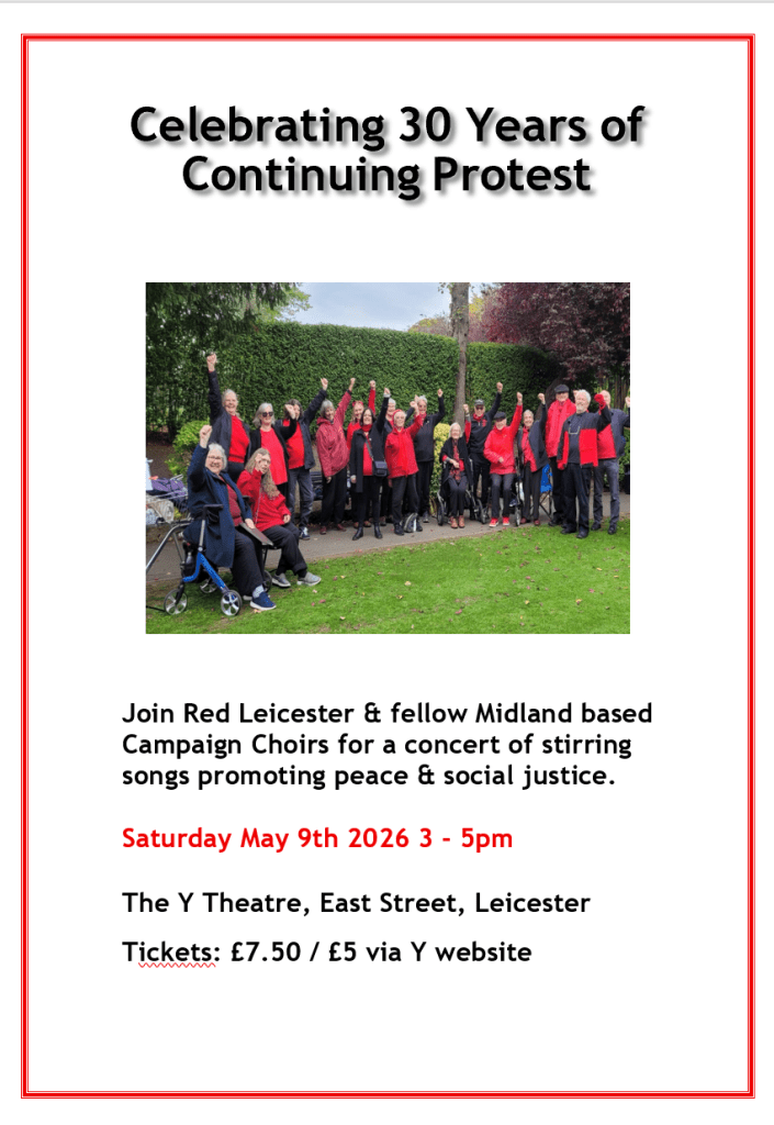 Red Leicester is celebrating 30 years of protest singing at our birthday party on May the 9th. We are delighted to welcome Nottingham Clarion, Sheffield Socialist and Tadhamon Choirs to join us. Busking on Granby Street and the Station from 12 to 1 and a brilliant concert at 3 pm. Come and join in the joy of resistance!