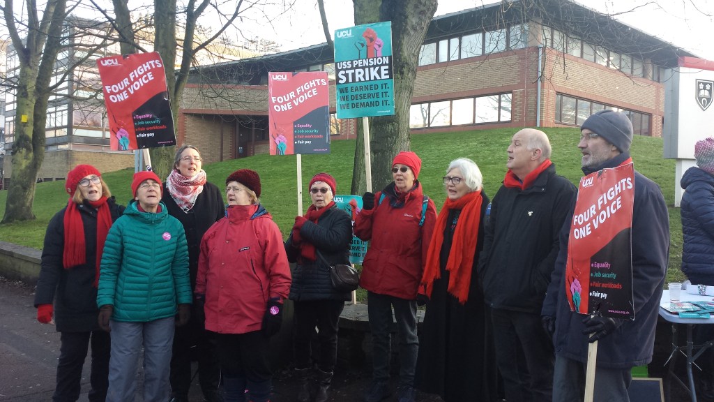 Members of Red Leicester serenading the early morning UCU pickets (6th March 2018) outside the University of Leicester in support of their protest against attacks on their pensions (photo courtesy of Ambrose Musiyiwa/Civic Leicester):
