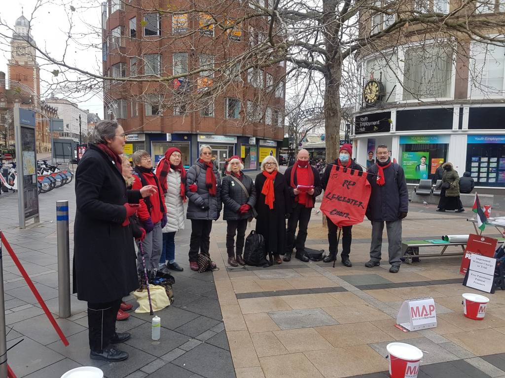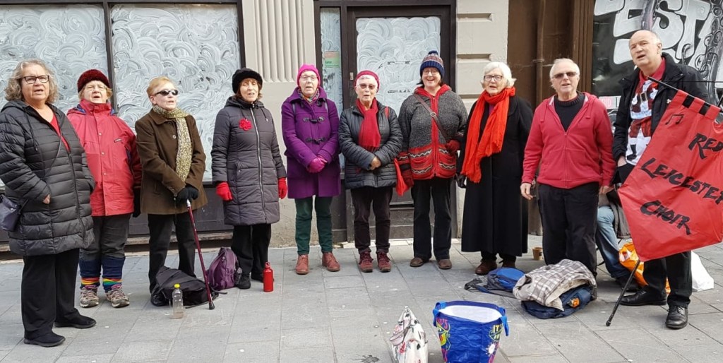 On Saturday 16th March a select band of Red Leicester Choir busked in the city centre for Medical Aid for Palestinians and raised £124.64 in the hour’s singing and a final total of £250 after generous donations.