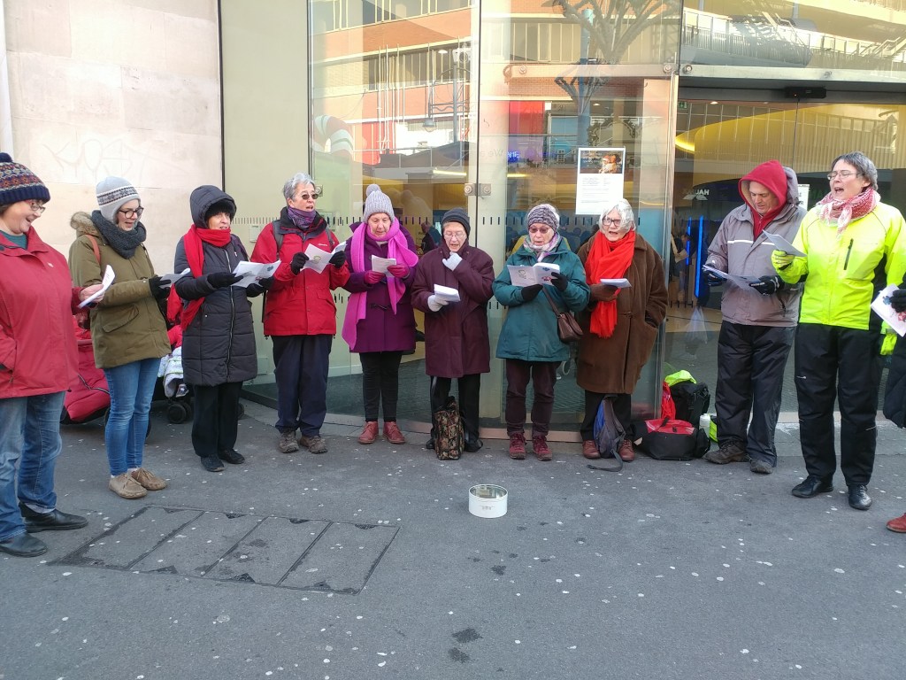 On Saturday, in sub-zero temperatures and freezing fog, a good number of Red Leicester choir gathered to busk in aid of Women’s Aid. We collected a grand total of £185 in an hour of singing, after which we went off to find hot drinks.