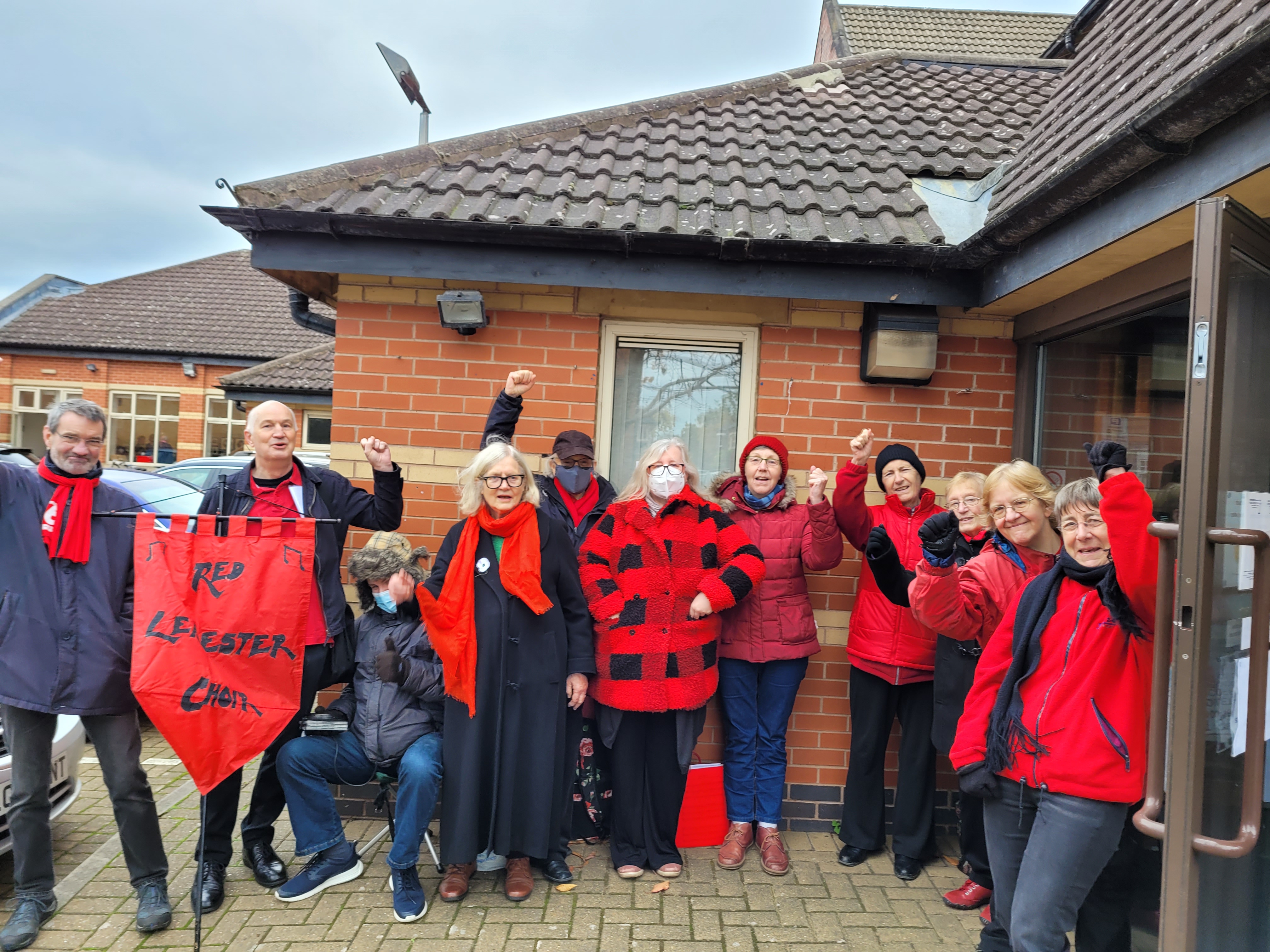 To demonstrate solidarity with all workers taking industrial action over their pay and conditions, Red Leicester sang on the National Union of Rail, Maritime and Transport Workers (RMT) picket line at Leicester station. The choir felt it important to show their support for the RMT’s struggle in defence of their livelihoods and in the face of a Tory government intent on making working people pay for their own incompetence and mismanagement.